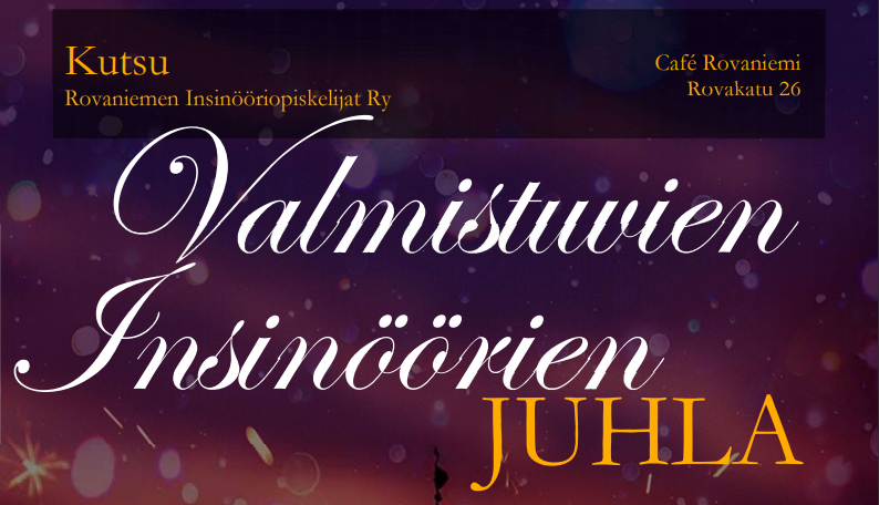 Rovaniemen Insinööriopiskelijat Ry haluaa kutsua sinut illalliselle Cafe Rovaniemeen valmistumisesi johdosta. Tule kanssamme nauttimaan hyvästä ruoasta ja kuulemaan myös Insinööriliiton puheenvuoro. Tilaisuudessa pääset verkostoitumaan muiden vastavalmistuneiden insinöörien kanssa ja saat vinkkejä työelämään liiton asiantuntijoilta.